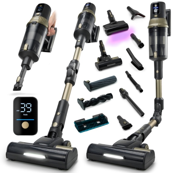 850 W, 310 AW wysoka moc ssania, Elektroszczotka ze światłem UV, Bezworkowy, Podświetlenie LED, 12 wymiennych szczotek i nasadek, 0,35L zbiornik na kurz, 4 tryby pracy, Wyświetlacz LED, Zginana rura, 180 m² powierzchnia sprzątania, Czas pracy do 60 min., Odkurzanie na sucho i mokro